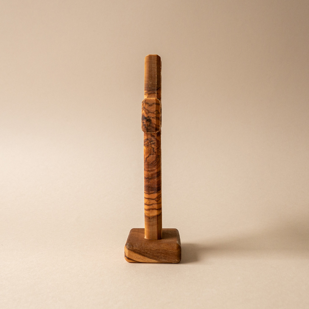 Maslinovo drvo stoljećima nosi simboliku mira, snage i ustrajnosti pa ovaj križ dobiva dodatno značenje kao duhovni čuvar doma. Svaki primjerak posebno je oblikovan i urezbaren, a prirodne razlike u bojama i vlaknima drva čine ga posebnim i neponovljivim. Motiv pletera podsjeća na neraskidivu vezu vjere, identiteta i tradicije. Stabilno postolje omogućuje jednostavno postavljanje na policu, oltar ili radni stol. Površina je zaštićena prirodnim uljima koja naglašavaju ljepotu materijala i čuvaju ga dugoročno.