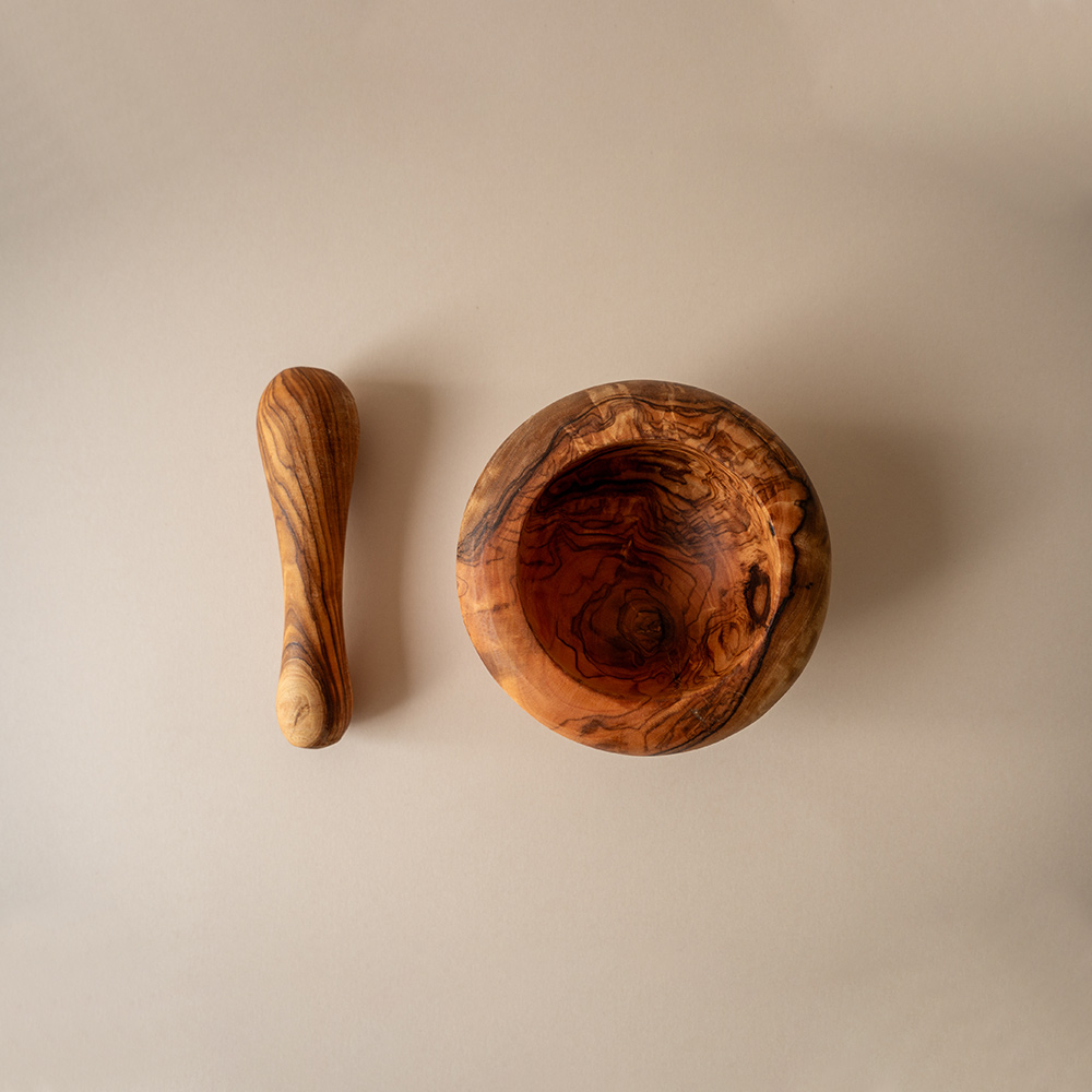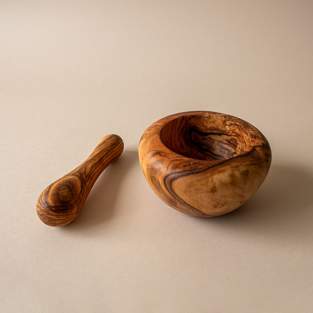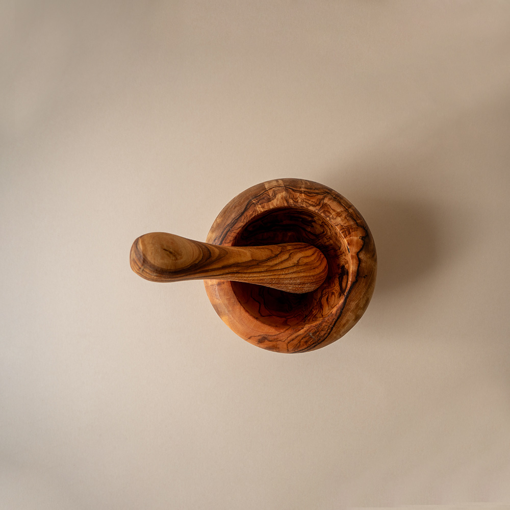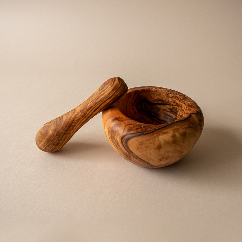 Maslinovo drvo cijenjeno je zbog svoje gustoće, čvrstoće i jedinstvenih uzoraka godova koji svaki mužar čine posebnim. Glatka unutrašnjost omogućuje učinkovito drobljenje, a zaobljeni oblik pruža stabilnost i ugodan osjećaj pri radu. Drvo prirodno odbija mirise i vlagu pa se lako održava bez upijanja aroma. Boja, uzorci i oblik mogu varirati, što vaš mužar čini pravim unikatnim predmetom.